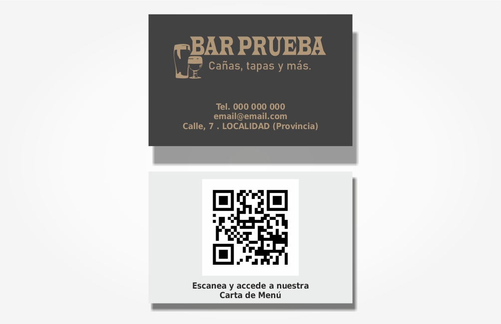 Tarjetas comerciales con las que mostrar el codigo QR de tu carta. Tarjetas en papel con diferentes opciones de gramajes, acabados, plastificados, etc.
